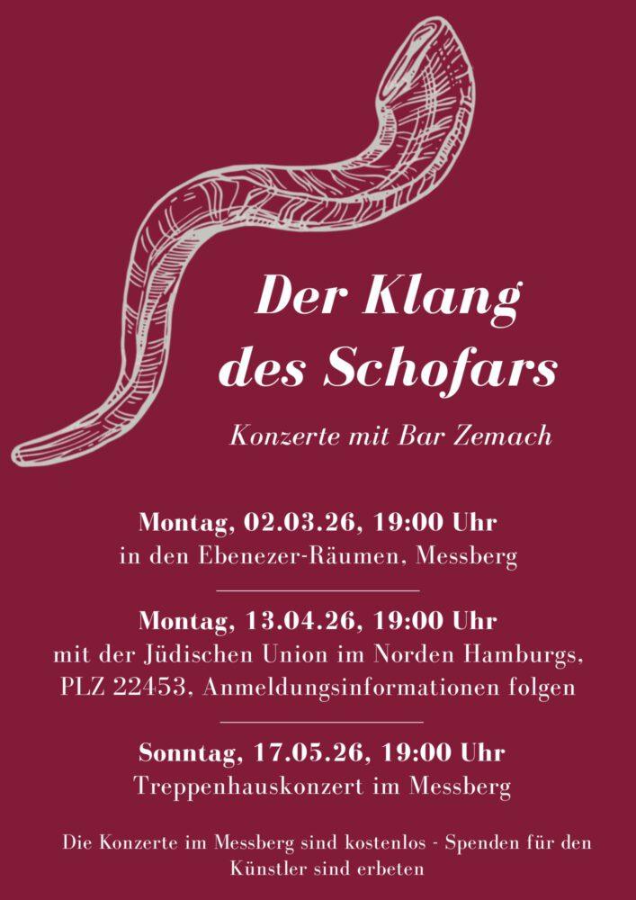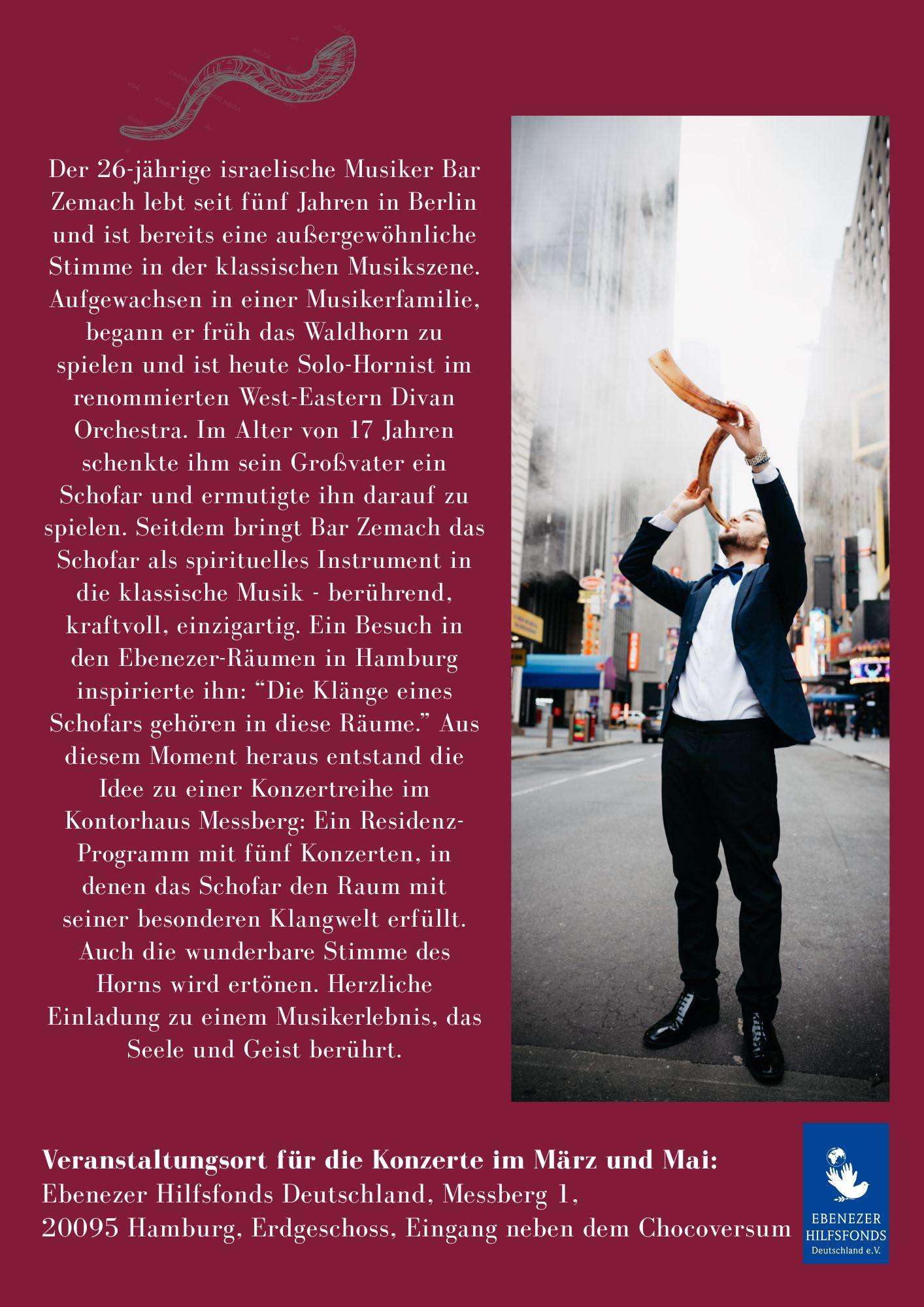 den Ebenezer-Räumen in Hamburg inspirierte ihn: “Die Klänge eines Schofars gehören in diese Räume.” Aus diesem Moment heraus entstand die Idee zu einer Konzertreihe im Kontorhaus Messberg: Ein Residenz-Programm mit fünf Konzerten, in denen das Schofar den Raum mit seiner besonderen Klangwelt erfüllt.